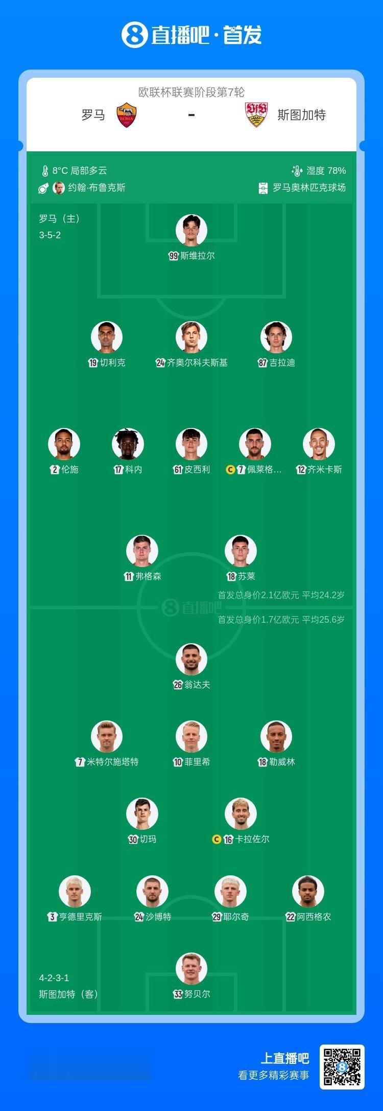 罗马首发:99-斯维拉尔、19-切利克、24-齐奥尔科夫斯基、87-吉拉迪、2-伦施、17-科内、61-皮西利、12-齐米卡斯、18-苏莱、7-佩莱格里尼、11-埃文·弗格森