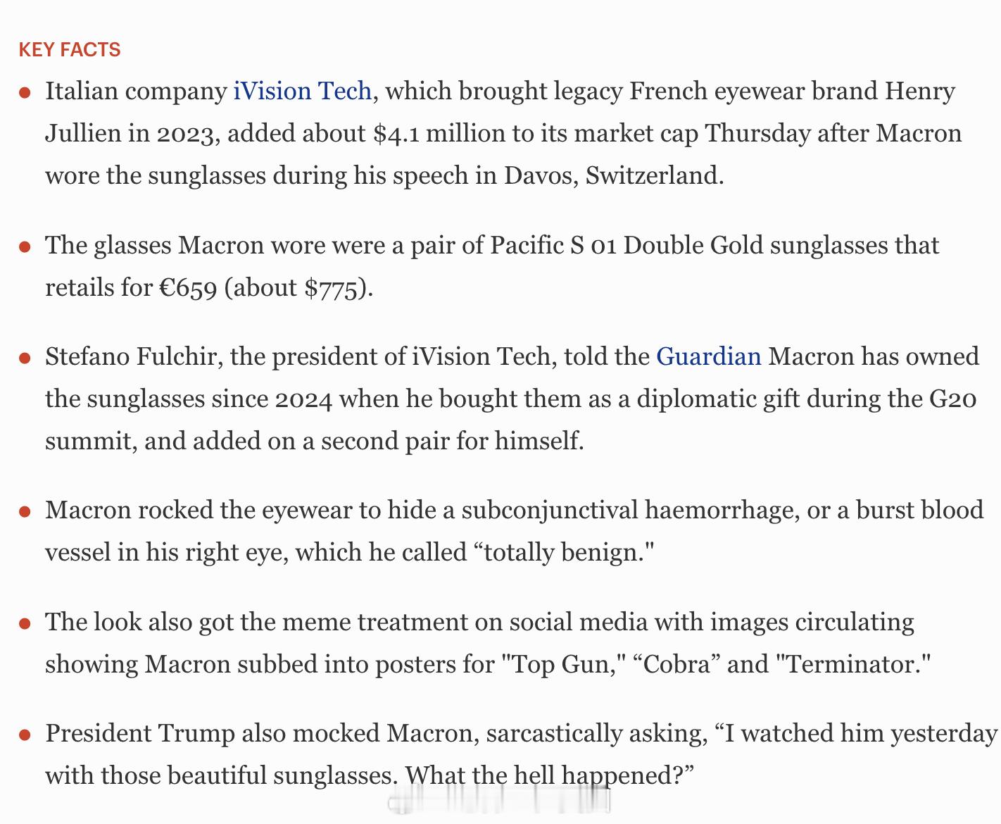 法国总统马克龙在达沃斯戴的这幅iVision Tech墨镜型号为Pacific S 01 Double Gold,售价约775美元(659 欧),之后火爆全网,让iVision Tech股票大涨28%,当天市值增加了大约410万美元。根据法国媒体报道称,马克龙戴墨镜是因为眼结膜下出血,一般不需要特殊治疗,通常在两周内会自行消退。热点现场海外新鲜事