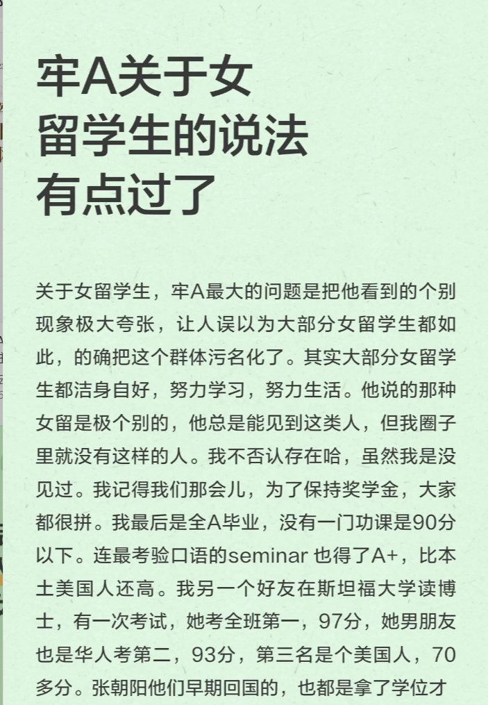 真是没想到很多女留学生,纷纷在网上开直播,希望网友不要对她们的恶意这么大其实大家对公费留学,德国理工科,美国藤校理工博士留学生好似没啥意见啊因为同样是女留子,去德国读功课和去美国学艺术,你看看评论区就知道谁是咋回事了,大家都门清的好学且成绩好的,身边父母老师同学也清楚为人,这些人不在牢A的评述范围内;牢A展开这个话题的由头,也是有家长来咨询留学事宜如果就想镀金拿文凭,但孩子自制力差、耳根子软、特别容易入歧途的,那花那么多钱很可能是送孩子入深渊的,家长了解自己孩子是哪个档位的,自然会下判断,女留子就不必对号入座了