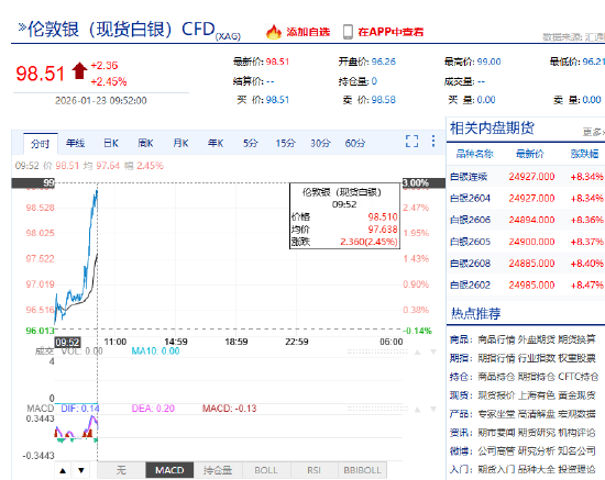 北京时间1月23日上午,现货白银持续走强,首次突破99美元/盎司关口,新年首月涨超38%。