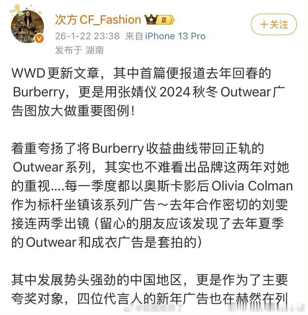 wwd报道Burberry收益回春,点名表扬张婧仪,并将她的广告图放大用作首图!