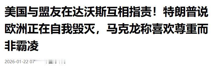特朗普在达沃斯论坛上的这番神操作,简直比好莱坞大片还要荒诞,直接把在场的几百位全球精英给整不会了,当地时间1月21日,这位美国总统在瑞士达沃斯的世界经济论坛上,足足讲了72分钟。 特朗普一开场就带着标志性的自夸风格,把美国经济的亮眼数据翻来覆去地说,称自己执政一年就实现了几乎零通胀和高增长的奇迹,核心通胀率三个月仅1.6%,第四季度增长率预计达5.4%,股市一年内创下52次历史新高,为民众财富增加了9万亿美元。 他还强调自己砍掉了大量联邦官僚岗位,每批准一项新规定就废除129项旧规定,削减千亿联邦开支,把预算赤字降低27%,这些举措被他包装成美国经济腾飞的核心引擎,言语间满是对自己政策的推崇,仿佛在场所有人都该认同他的执政逻辑。 但熟悉内情的人都清楚,这些数据背后藏着关税政策对全球贸易的冲击,只是他绝口不提这种繁荣对盟友的伤害。 就在精英们还在消化这些夸张数据时,特朗普话锋一转,直接将炮火对准欧洲,直言欧洲正在自我毁灭,很多地方已经变得面目全非,而且是朝着负面方向发展。 他指责欧洲在移民和能源政策上一塌糊涂,失控的大规模移民和无休止的外国进口拖垮了发展,放弃传统能源追求绿色新政更是骗局。 更刺耳的是,他重提收购格陵兰岛的主张,声称只有美国能保护这片土地,还反过来指责丹麦忘恩负义,直言没有美国的保护,丹麦或许早就该说德语了。 这番论调让在场欧洲代表脸色凝重,要知道格陵兰岛是丹麦自治领地,这种公开索要领土的言论,早已超出正常外交范畴,暴露的是赤裸裸的霸权野心。 他丝毫没有给盟友留余地,连前一天刚批评过他的加拿大总理卡尼、法国总统马克龙也没能幸免。针对卡尼关于国际秩序破裂的言论,他直接回怼加拿大能存在全靠美国宽容,提醒对方认清现实;谈及马克龙时,他带着嘲讽的语气提及对方的太阳镜,暗讽其故作强硬。 而这一切都发生在马克龙明确表示不打算和他对话,还要求北约在格陵兰岛举行军演之后,双方的针锋相对让现场氛围愈发紧张。没人敢相信,一位美国总统会在如此高端的国际场合,用近乎孩童斗气的方式攻击盟友,这种不顾外交礼仪的操作,让在场精英们既尴尬又震惊。 更荒诞的是,特朗普一边吹嘘美国的贸易政策,称通过关税将每月贸易赤字削减77%,出口增长超1500亿美元,一边又抱怨北约付出与回报不对等,声称美国为联盟付出太多却得不到感激。 他甚至在演讲前转发帖子,将北约和联合国列为美国的内部威胁,这种前后矛盾的表态,让人摸不清他到底想传递什么信号。 要知道北约是跨大西洋联盟的核心,这番言论无疑是给本就紧张的盟友关系投下重磅炸弹,也让欧洲各国彻底看清,所谓的盟友情谊在他眼中不过是利益交换的筹码。 演讲结束后,各方批评声接踵而至。瑞典首相直言演讲充满不公且与事实不符,比利时官员批评其政策缺乏逻辑,欧洲绿党呼吁各国团结抵制这种霸凌行径。 欧洲的反击也来得迅速,丹麦一养老基金宣布清仓美国国债,欧洲议会冻结了与美国的贸易协定批准程序,马克龙更是直接无视美方警告,坚持推动北约在格陵兰岛的军演。 这些反应都印证了特朗普的强硬政策正在加速西方联盟的分裂,所谓的西方秩序,早已在他的一次次挑衅中濒临破裂。 这场72分钟的演讲,与其说是经济政策阐述,不如说是一场霸权宣言。特朗普用自夸、指责、嘲讽交织的方式,将个人风格凌驾于国际规则之上,看似强硬的表态背后,是对多边关系的漠视和对国际秩序的破坏。 当一个国家的元首把国际论坛变成个人秀场,把盟友当成可以随意拿捏的对象,受损的不仅是自身的国际信誉,更是全球治理的根基。 未来欧洲与美国的矛盾还会如何升级?西方联盟能否守住最后的底线?欢迎在评论区留下你的看法。