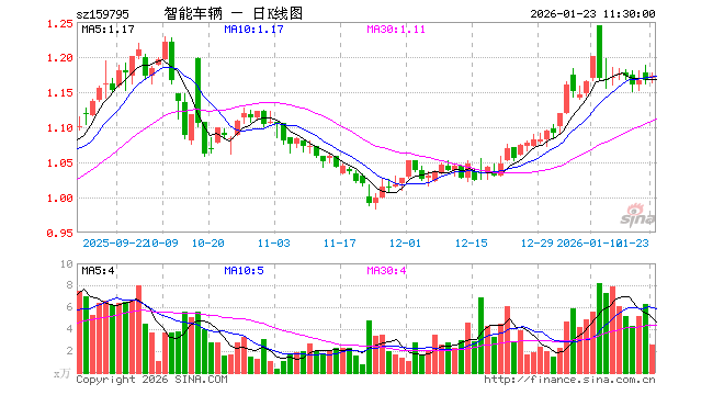 1月23日,截止午间收盘,智能汽车ETF汇添富(159795)涨0.51%,报1.173元,成交额299.98万元。智能汽车ETF汇添富(159795)重仓股方面,拓普集团截止午盘涨1.05%,豪威集团跌0.25%,科大讯飞涨0.98%,比亚迪跌0.49%,长安汽车涨0.09%,赛力斯跌0.09%,芯原股份跌1.50%,立讯精密跌2.04%,德赛西威涨1.23%,北京君正跌3.49%。