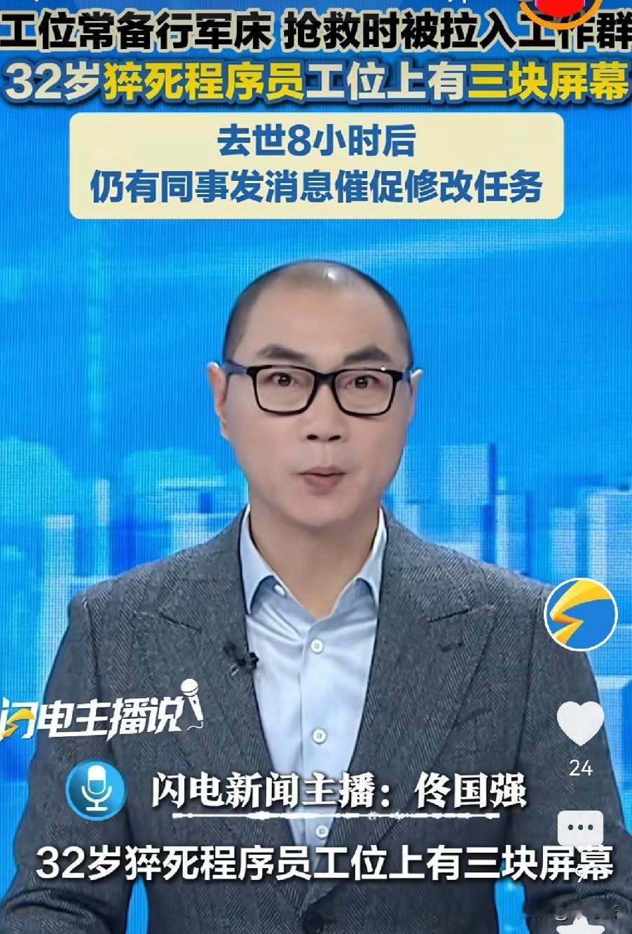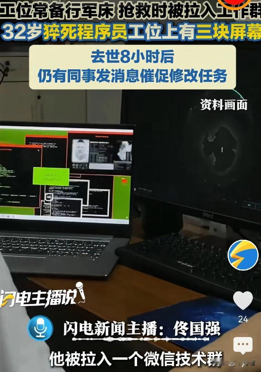人在抢救室,自己还被公司拉入技术群,甚至在人已经去世后,还有同事发消息给他,催他交修改任务,这就是打工牛马的一生啊,短暂的停留在了32岁。 近日,广州市黄埔区一名32岁的程序员猝死在了这样高强度的工作压力下,在他的工位上摆着三块屏幕,自己在各大微信技术群里分身,最早下班在九点半,最晚都在11点以后了,当天他工作这一天,还是在周六。 程序员的工资是不低,这么高强度的工作,公司技术含量高的程序员,一位顶掉好几个,可这工作量实在太大了,一个人面对三块屏幕,可能懂行的人会说这算什么,更多的屏幕自己都能看过来,可是人的生命是有限的,高强度,高专注力,不是每个人都身体素质都一样啊。 这不是孤例,而是无数“打工牛马”的生存缩影。32岁,本该是人生蓄势待发的年纪,他却在无休止的加班中耗尽了生命,只留下工位上沉默的屏幕,和那些永远无法回复的工作消息。一个技术骨干就这么没了,对公司来说可能只是少了一个干活的人,可对他的家人来说,是天塌了啊! 咱打工人拼死拼活干活,是为了更好地生活,不是为了把自己累死在工位上。愿这哥们儿一路走好,也愿咱们所有打工人,都能在挣钱的同时,守住自己的健康,别让“打工牛马”的命运,变成无法挽回的悲剧。