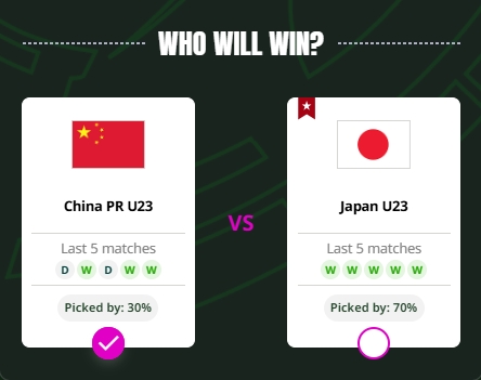 亚足联官网U23亚洲杯决赛支持率:中国队30%,日本队70%