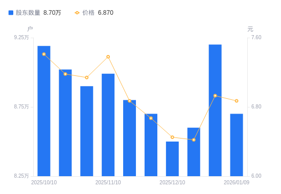 日期A股户数(户)流通A股户均持股数(股)户均持股市值(万元)2026-01-208500020148.6614.002026-01-098700019685.4713.522025-12-319200018615.6112.902025-12-198600019914.3712.792025-12-108500020148.6613.002025-11-288700019685.4713.132025-11-208800019461.7713.372025-11-108990019050.4614.062025-10-318900019243.1013.742025-10-209020018984.7313.63