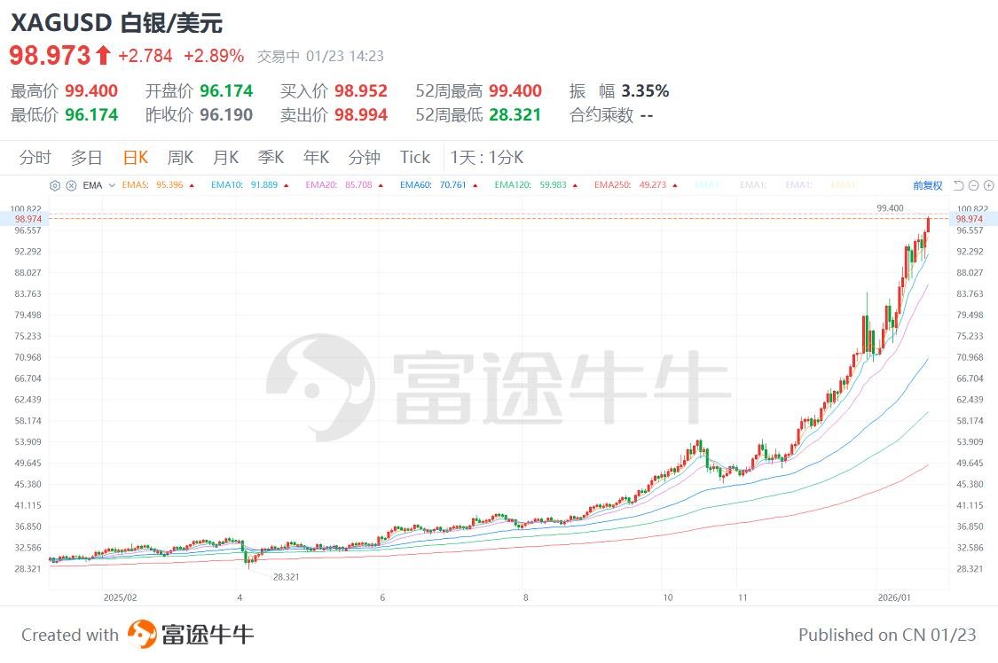 格隆汇1月23日|现货白银价格延续强劲涨势,今日盘中接连突破多道整数关卡,首次站上99美元/盎司,最高涨至99.4美元/盎司,创下历史新高,今年迄今累计涨超38%,离100美元心理大关仅一步之遥,交易商最新指出,白银已经成功突破主要阻力区,令100美元大关触手可及。分析人士指出,近期白银矿商与现货价格同步走强,是多方势头延续的有力佐证。
