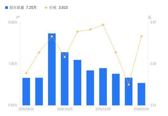 近一年(2025年1月20日至2026年1月20日),广东建工A股股东户数从8.02万户,减低至7.25万户,降幅9.58%,区间股价上涨14.76%。