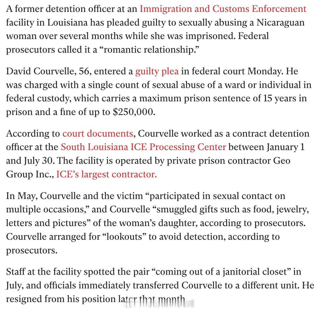 56岁的David Courvelle是是私营监狱公司 GEO Group 雇佣的合同制拘留官,在ICE位于路易斯安那州巴希尔(Basile)的拘留中心工作,负责监管和保障在押人员安全。David Courvelle被爆出长期性侵在押移民女性的案件,他已在联邦法院认罪。受害者是一名来自尼加拉瓜的女性移民,当时正被ICE关押在该中心。检方指控,2025年初Courvelle与该名女性发展出“个人与恋爱关系”,到2025年5月至7月之间,两人多次发生性接触,持续数月。Courvelle被指利用职务便利,将食物、首饰、信件、自己家人的照片等“礼物”带入拘留中心,还安排其他被关押人员作为“哨兵”帮助他与对方在隐蔽地点(如清洁工具间)发生性行为,以躲开监控和同事。Courvelle被控一项“虐待被关押人员或联邦羁押人员的性犯罪”(sexual abuse of a ward or individual in federal custody),属联邦重罪,最高可判处15年监禁及最高25万美元罚款。正式判决日期定在2026年4月10日,届时将由法官决定具体刑期。热点现场海外新鲜事今日热点