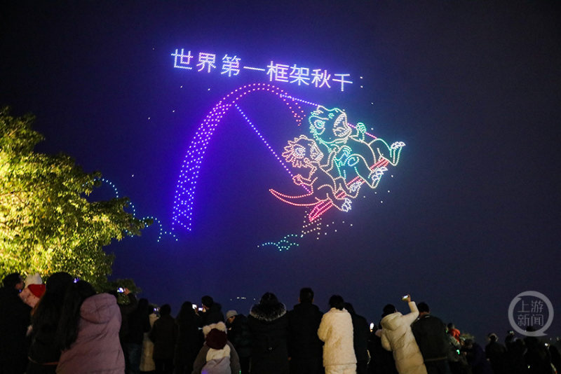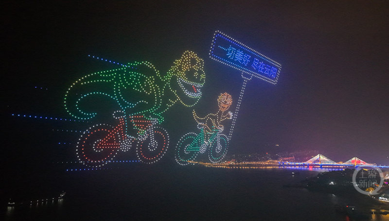 无人机编队以夜空为画布,依次绘出云阳文旅IP“龙宝”“乖妹”“万里长江第一梯”登云梯、巍峨张飞庙、“世界第一框架秋千”以及“上岸之城,心想事成”等绚丽图案与字样,将自然奇观、历史底蕴与美好祝福浓缩成一场流光溢彩的空中叙事,点亮江岸,也惊艳众人。