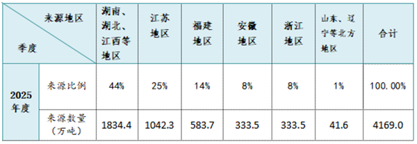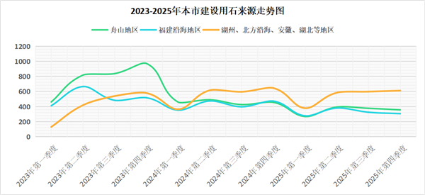 2、2025年上海市建设用石来源舟山地区占29%;福建沿海地区占26%;湖州、北方沿海、安徽、湖北等地区占45%。从近三年的走势来看,舟山地区和福建沿海地区的供应量比例逐渐趋近,湖州、北方沿海、安徽、湖北等地区的占比逐步提高,且趋于稳定,在市场供应充足的情况下,船运价格波动的影响会在建设用石的来源上体现。