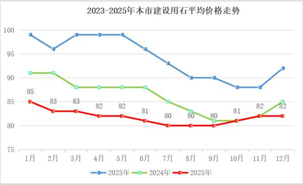 第四季度上海市建设用石供应价格处于低位运行,但较第三季度略微反弹状态。根据协会龙吴路10-12月建设用石市场价格调研,江船和海船的散货运输价格目前处于近三年低点,到11、12月小幅返弹。2025第四季度平均调研价格81.7元/吨,同比2024第四季度平均调研价格83元/吨,下降了1.6%;与2025第三季度平均调研价格80元/吨,上涨了2.1%。目前建设用石供给端较充裕,能确保市场供应保障。