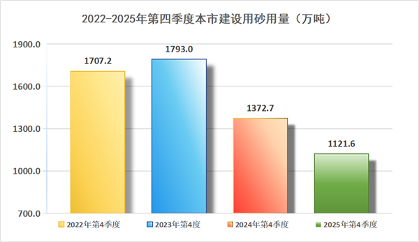2、2025年第四季度上海市建设用砂合计使用量1121.6万吨,同比2024年第四季度的使用量减少18.3%。单季降幅与全年同步,无明显季节性反弹,建设用砂总量年末收缩趋稳。