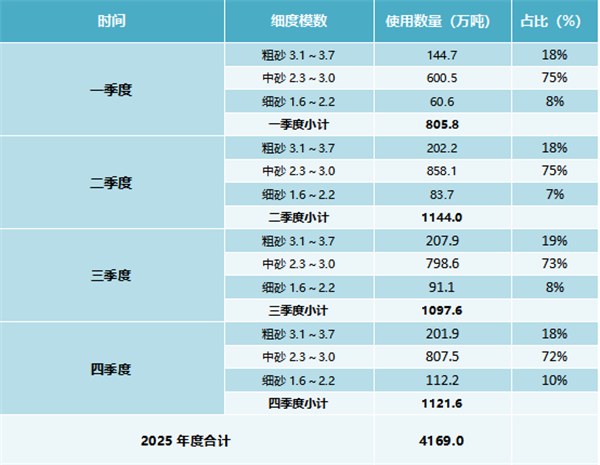 与此同时,机制砂在建设用砂中的占比保持81%的高位,其颗粒级配与混凝土配合比精准适配。其中,中砂使用量最高,每季度占比都高达70%以上,而细砂使用数量最少,每季度占比均不超过10%。