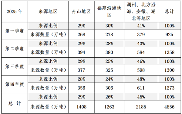 2025年上海市建设用石来源舟山地区占29%;福建沿海地区占26%;湖州、北方沿海、安徽、湖北等地区占45%。从近三年的走势来看,舟山地区和福建沿海地区的供应量比例逐渐趋近,湖州、北方沿海、安徽、湖北等地区的占比逐步提高,且趋于稳定,在市场供应充足的情况下,船运价格波动的影响会在建设用石的来源上体现。