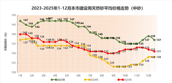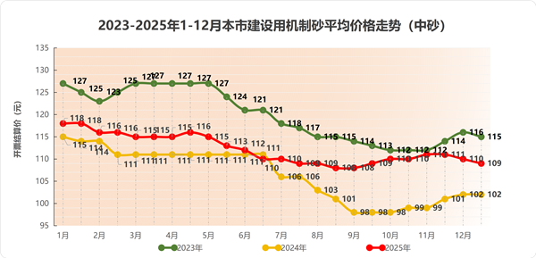 2025年度上海市建设用天然砂中砂龙吴路调研均价117元/吨,搅拌站开票结算均价129元/吨,同比2024年度天然砂价格增长3.2%;机制砂中砂龙吴路调研均价97元/吨,搅拌站开票结算均价107元/吨,同比2024年度机制砂价格增长4.9%。
