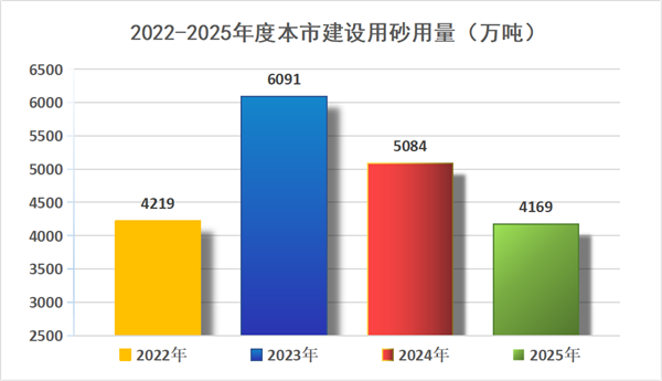 2025年度上海市建设用砂合计使用量4169万吨,同比2024年度的使用量减少18.0%,较2023年降幅扩至35.6%。上海市建设用砂需求呈“持续收缩、降幅扩大、季度同步”的特征,反映城市建设从增量转向存量、行业从规模扩张转向质量提升的阶段变化。