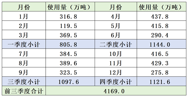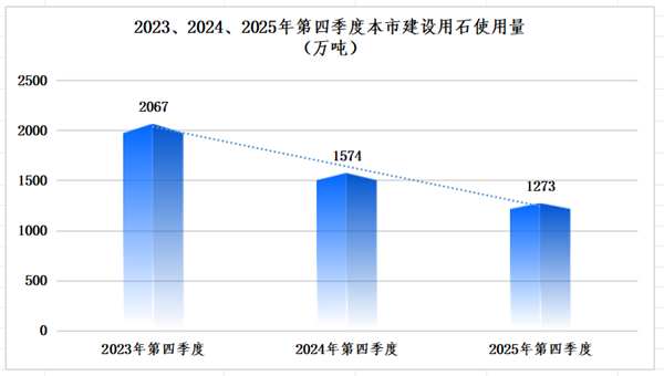 上海市四季度建设用石使用量1273万吨,同比2024年四季度1574万吨使用量,减少了19.1%;同比2023年四季度2067万吨使用量,减少了38.41%;环比2025年三季度的1300万吨,下降了2.08%。