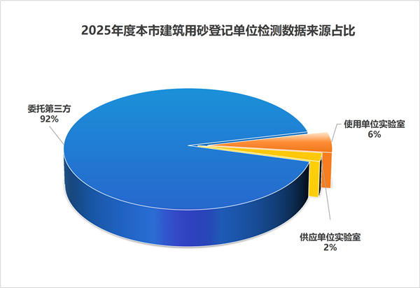 2025年共有218家供应商开具质保书。委托第三方检测机构检测的201家,占92%;使用单位合作实验室检测的12家,占6%;另外5家,占2%,自己是生产单位又是登记供应商,利用自己内部实验室检测。根据质保书信息,供应上海的建设用砂均为合格。