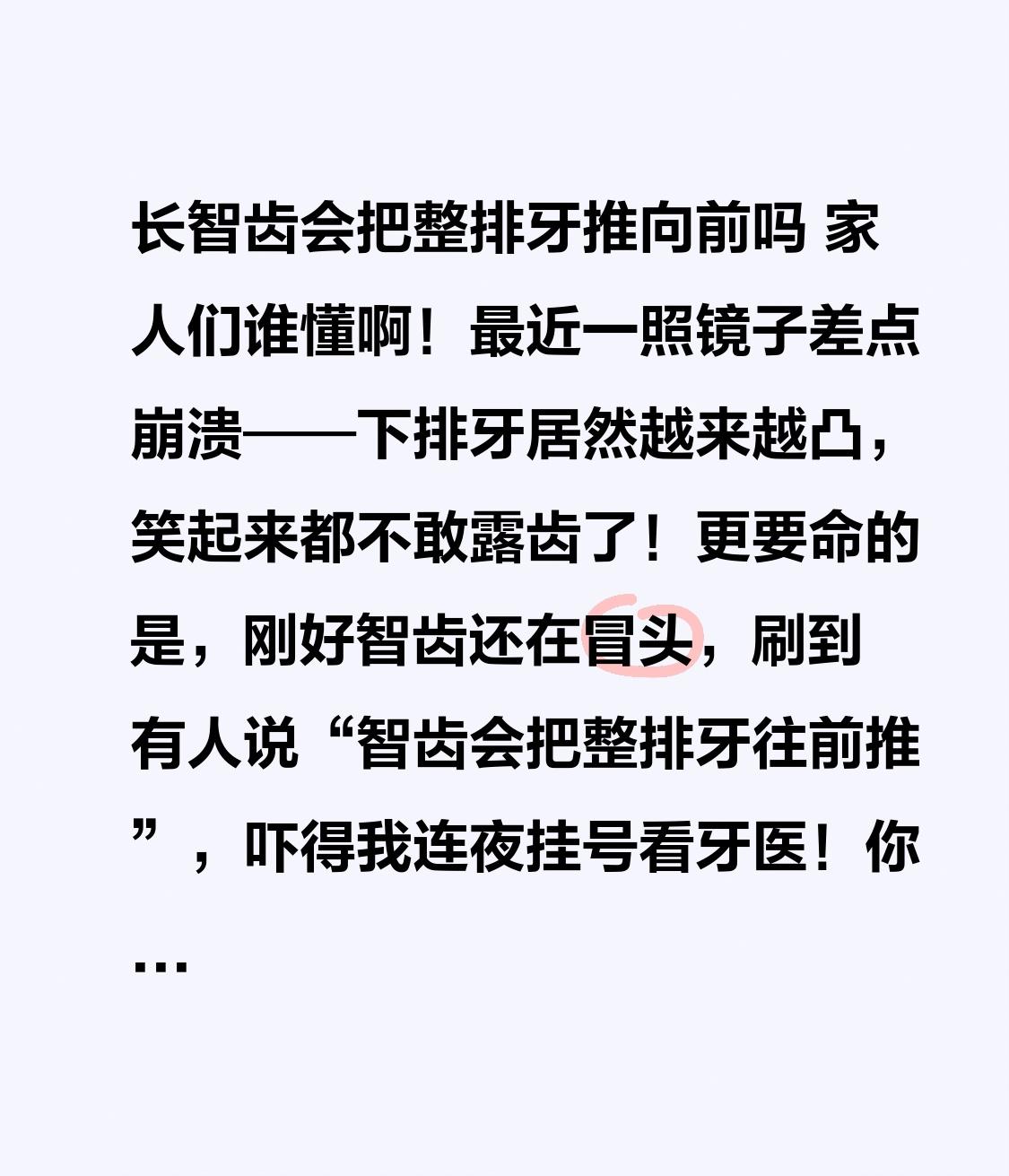 长智齿会把整排牙推向前吗 家人们谁懂啊!最近一照镜子差点崩溃——下排牙居然越来越凸,笑起来都不敢露齿了!更要命的是,刚好智齿还在冒头,刷到有人说“智齿会把整排牙往前推”,吓得我连夜挂号看牙医!你们是不是也有过这种经历?长智齿后感觉牙齿越来越不齐,甚至出现牙缝变大、咬合不舒服的情况?到底智齿是不是“毁牙凶手”?今天这条视频彻底说透,看完你再也不用瞎担心! 其实我之前一直坚信,智齿就是罪魁祸首!毕竟小时候牙齿整齐得能当镜子照,怎么偏偏智齿长出来,牙齿就开始“跑偏”了?直到医生拿着我的牙片说:“你这牙齿前凸,还真怪不到智齿头上!” 当时我直接愣住,这和网上说的完全不一样啊! 医生告诉我,大部分情况下,智齿根本没那么大“力气”推歪整排牙!咱们的牙槽骨空间有限,智齿萌出时确实可能挤压邻牙,但这种力量特别微弱,顶多影响旁边一两颗牙,想把整排牙都推向前,堪比“蚂蚁搬大象”!那为啥很多人长智齿后,感觉牙齿变不齐了? 这里就有个关键转折点!真正让牙齿移位的,可能是你忽略的这些事:比如长期用一侧咀嚼、经常咬指甲、晚上磨牙,甚至是遗传因素!而智齿萌出的时间,刚好和牙齿自然移位的阶段重合,就背了“黑锅”! 但医生也说了,有一种特殊情况要警惕:如果你的智齿是横向阻生、倒置生长,而且牙槽骨比较松软,长期的慢性挤压,可能会让前牙出现轻微移位,尤其是本身牙齿就比较拥挤的人,风险会高一点!这时候可不能硬扛,得及时拍牙片检查! 我之前因为害怕拔牙,硬扛了半年,结果牙齿越来越不舒服,还出现了牙龈发炎的情况!现在终于拔完智齿,才发现之前的担心都是多余的! 其实很多人都和我一样,对智齿充满恐惧和误解,总觉得拔牙会伤牙、会疼到崩溃。但真正了解后才知道,该拔的智齿及时拔,才是对牙齿最大的保护!如果你也在被智齿困扰,或者担心牙齿移位,评论区留言“智齿”,我把医生教我的护牙技巧分享给你!记得点赞收藏,转发给身边正在长智齿的朋友,别让他们再被谣言误导啦!