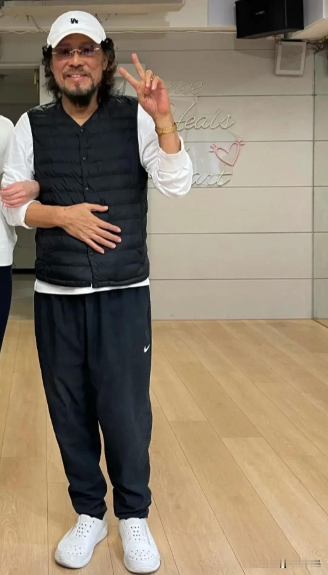 台湾省超级主持人张菲,罕见现身,他戴着白色棒球帽,穿着蓝色背心运动裤,留着经典的