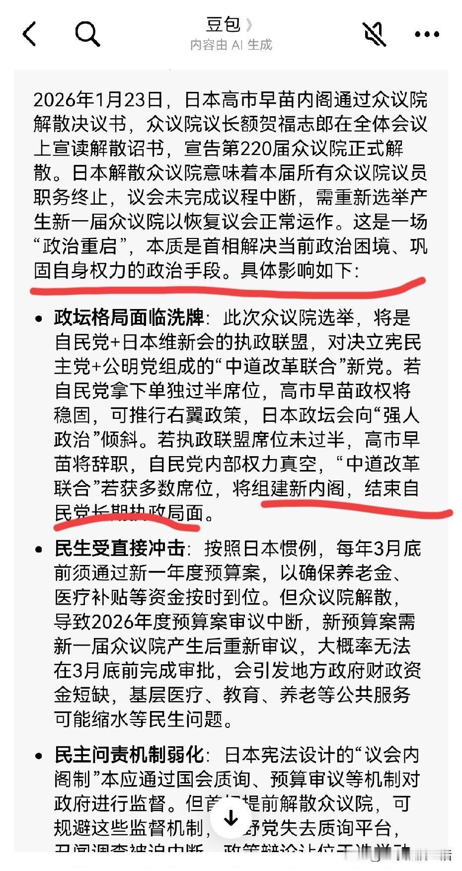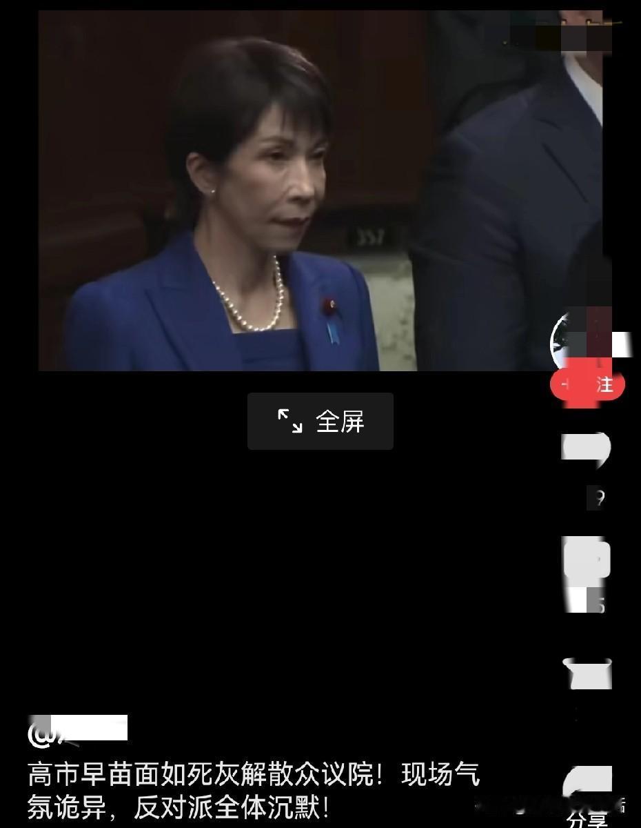 有多少人认为日本解散众议院是给高市难堪? 宣读结果之后,有人说她是面如死灰,更多人觉得她是内心透露出来的阴狠,看她的表情,一股寒气直逼后背,不由得打起冷战,这可能才是她的真面目。 其实这只是她的一步棋,早就在她的计划之内的,也就相当于内部重新进行洗牌,就和我们一些分公司一样的道理,集团空降一个总经理以后,把原来的老员工全部清空,重新进行竞岗和招聘,以此来获得更多的威信和话语权,把那些反对的声音尽量降到最低。 不过她这也是在赌自己的运气,如果在后面的剧情发展,没有按照自己预设进行,很有可能就此结束。 不过现在是她的最好时机,错过了可能就更危险了。 高市如果得逞了,对我们的威胁将可能是日本战败以来最大的,我们更要警惕了。 众议院解散,不是结束,而是开始!