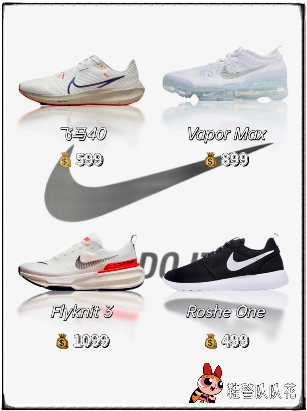 Roshe One当时是人脚一双的爆款跑鞋,外观低调,日常与运动兼得的一双跑鞋。飞马和飞线系列则是NIKE的跑鞋代表作,Vapor Max也是火爆一时的跑鞋,大气垫要多舒服有多帅