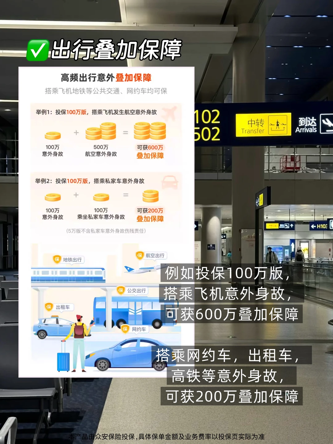 [三R]还有出行叠加保障,如投保100万版,搭乘飞机意外身故,可获600万叠加保障;搭乘网约车、出租车、高铁等意外身故,可获200万叠加保障,再次感叹真的是为经常出行的人想的很全面了