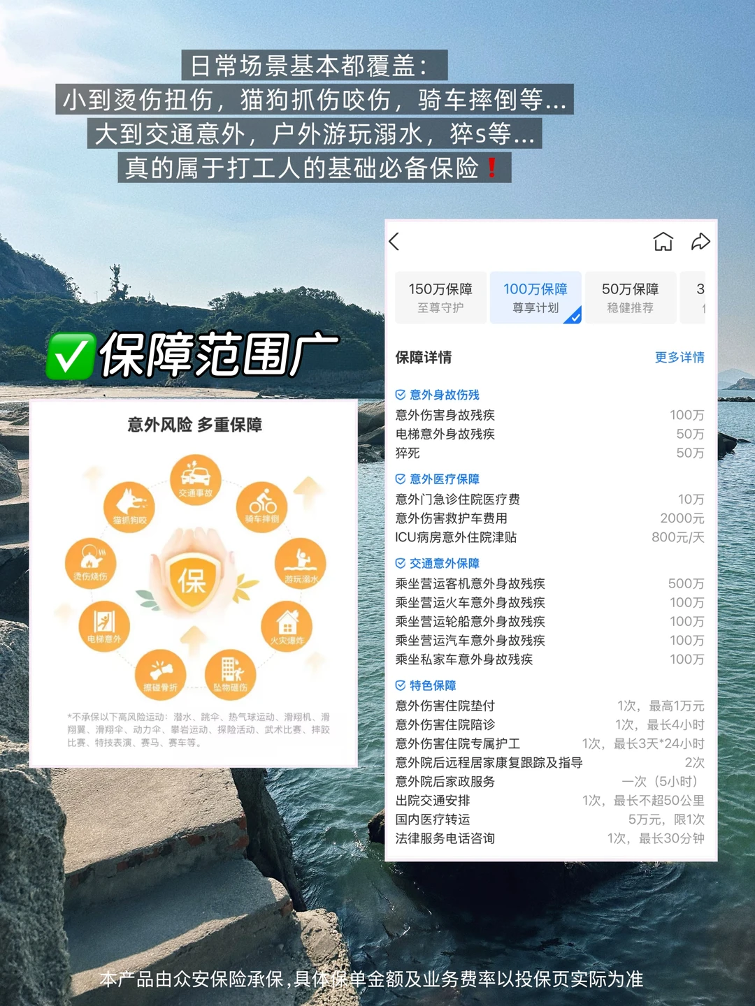 [二R]保障范围很全,日常生活场景基本全覆盖,小到摔伤擦伤,宠物抓咬,大到火灾爆炸、意外骨折等…甚至猝死都在范围内,有50万的保额。