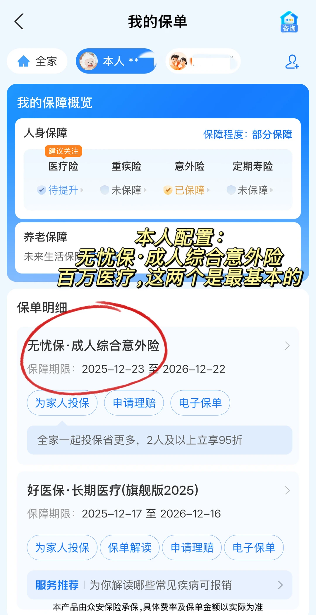 [向右R]我买的是支付宝上的【无忧保·成人综合意外险】,保费低,我这种学生完全可以承担,一个月才20几💰,和父母一起投保还有95折优惠,但是包含的保障很丰富,还是比较满意的。