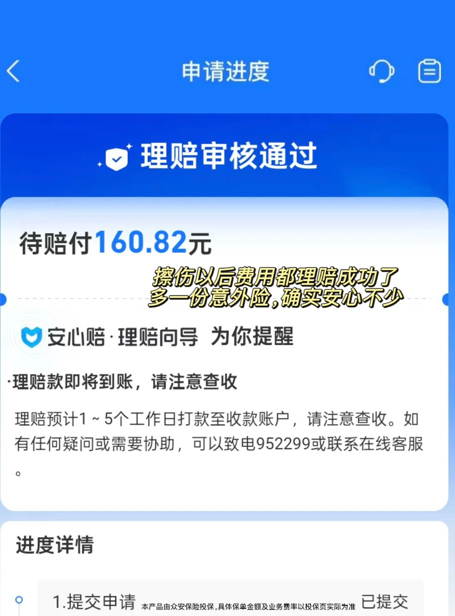 [一R]我选的成人意外险100万版本,保额比较高,是0免赔额,意外医疗保额有10万,不限社保内外,医保内100%比例赔付,医保外还有80%比例赔付,每个月就二十几块钱,完全可以负担得起,被电动车撞了以后花了100多,都理赔了,打款也很快!