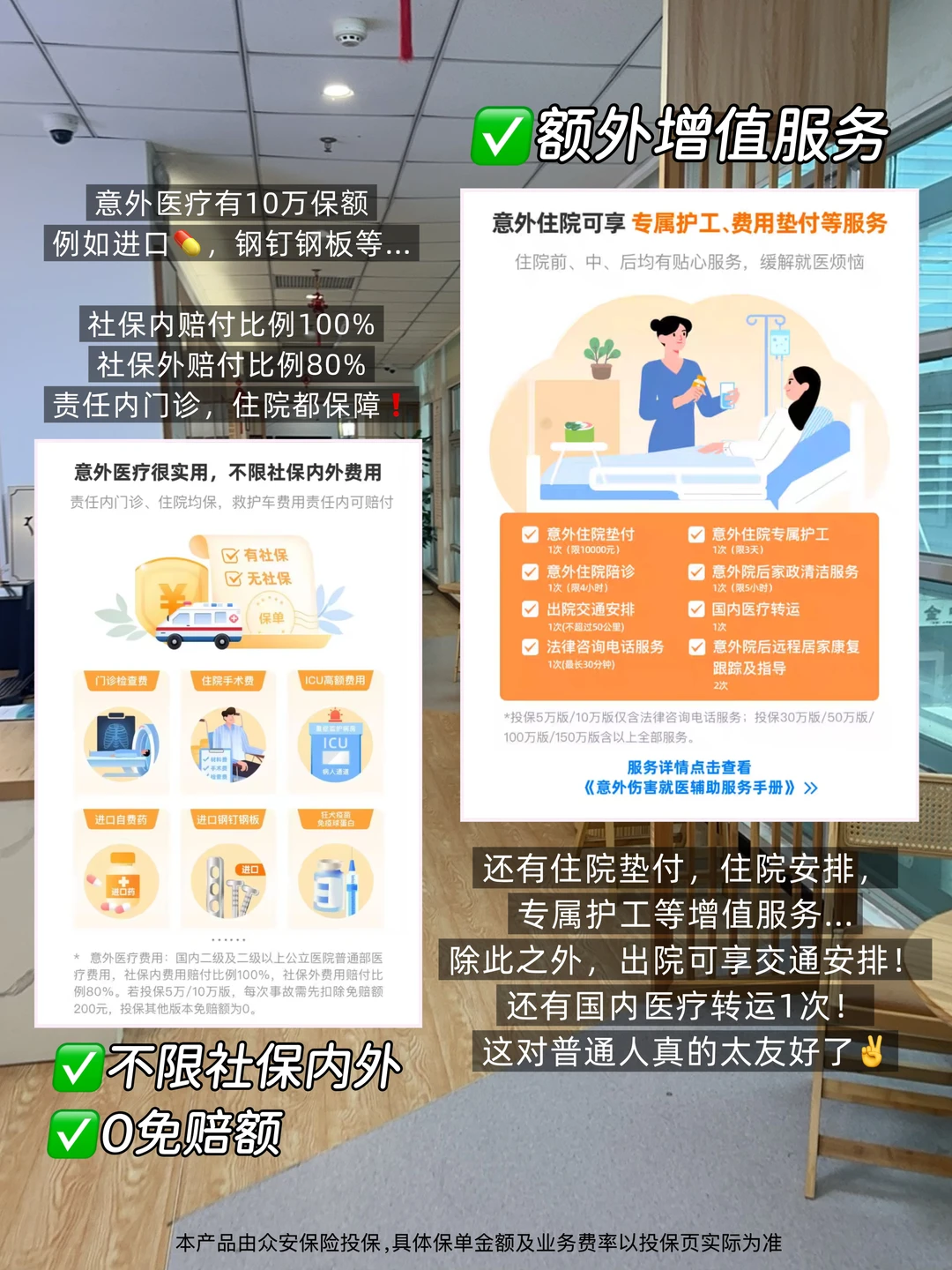 [四R]还有很重要的一点是:这个意外险有额外的增值服务,比如住院安排,住院陪诊,专属护工等…对于年轻人来说就很友好,就算是一个人住院也可以安排护工帮忙陪诊照顾,方便太多。