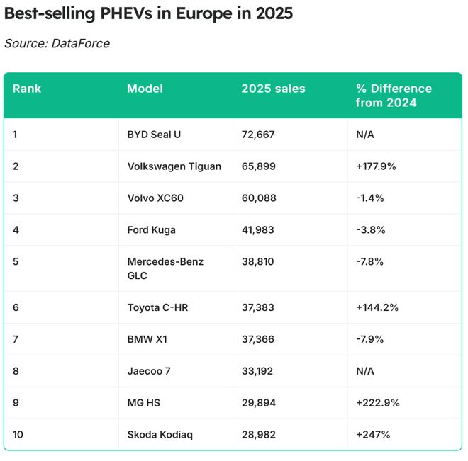 欧洲插混市场呈分化趋势,比亚迪SealU的领先优势明显。
