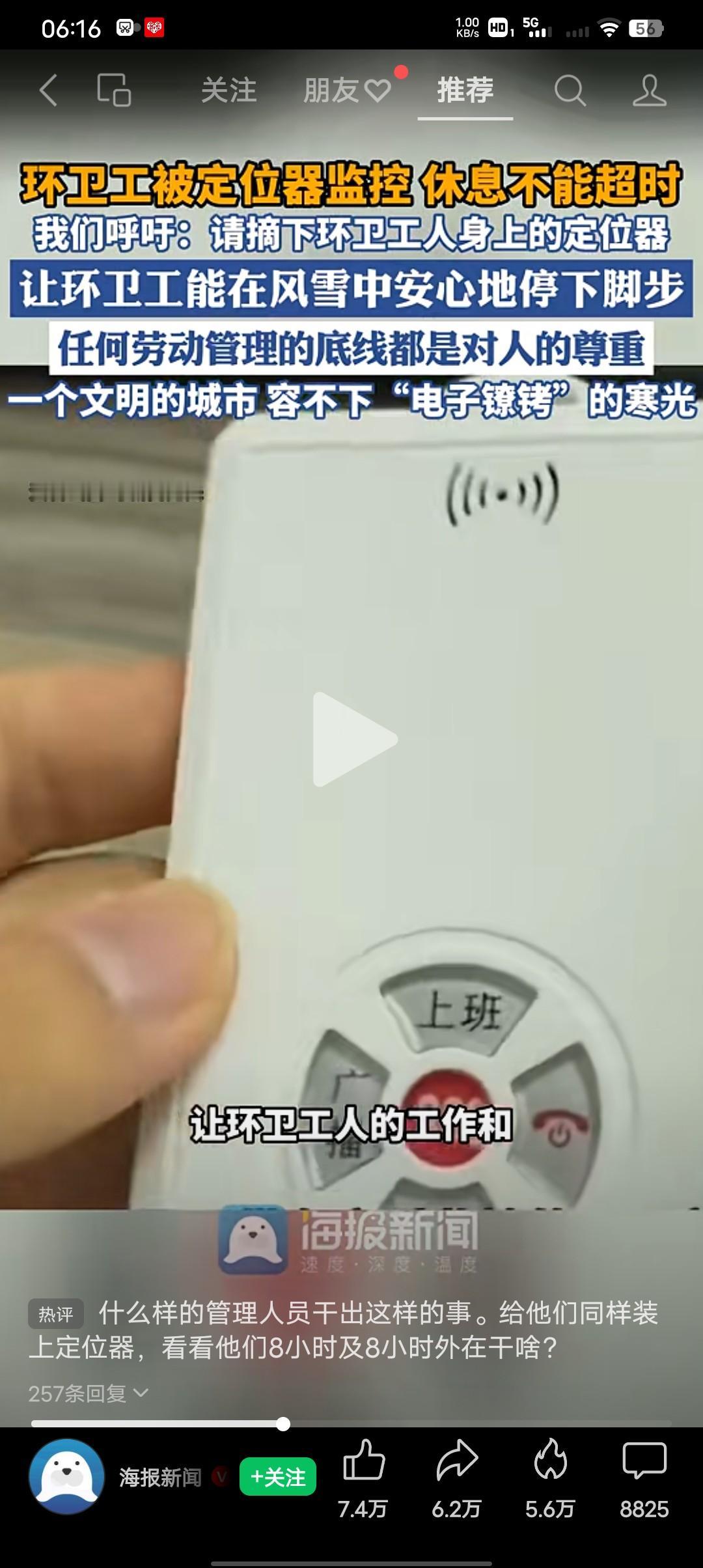 一个文明的城市容不下“电子镣铐”的寒光,环卫工称带定位器工牌工作“定位不动会被罚款” 山西运城街头正在清理积雪的环卫工人在听到路人一句暖心的关心之后却说“我们佩戴有定位监控的工牌,不动的话会被罚款的”这句话引起了众多网友的热议,面对这群最弱势的群体,却用着最冰冷最无情的电子监控管理制度,确实让人汗颜。众多网友呼吁,请摘下运城环卫工身上的定位工牌刻不容缓。 记者致电山西运城环卫中心,工作人员的回答更是无情:环卫工带定位器的工牌工作,一方面是保障安全,另一方面工作要有轨迹,确有时限要求,休息不能超过一定时间,后台有专人监控,片区管理员也会核实,“环卫工都是年龄比较大的,不可能让他们一直走动,要考虑他们的体力,不存在一不动就罚款” 有一条热评是这样说的,一个环卫工人的背后竟然要有好几个人管理加上智能监控设备,有网友说请善待他们吧!他们拿着最低的工资干着最累的活,有人说真是把人性演绎的淋漓尽致了,人工智能加人工管理,却用到了最底层的环卫工身上,他们一个月的工资也就千块钱左右吧!真的要把他们的油榨干吗? 还有人建议这位女接线员也要佩戴工牌要一视同仁嘛,还有全国公务员事业单位工作人员佩戴此工,要全心全意为人民服务嘛。