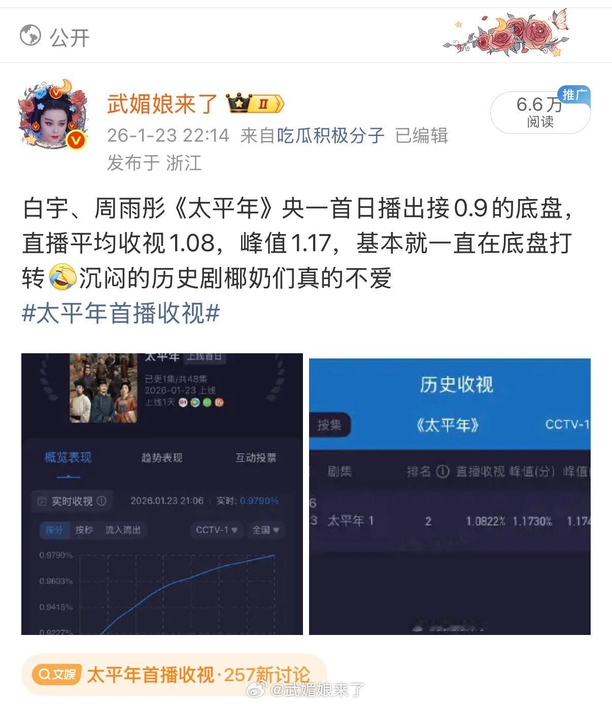 太平年首播收视《太平年》首播收视不佳粉丝不用急着拿细糠来挽尊,这部剧大家不爱看跟演员没多大关系,就这个题材观众就不爱。电视剧要讲得观众有兴趣才是真本事,而不是追着给观众补课,你不爱听?那你没文化这样吧🤷再说了。对这一段历史有兴趣的看这个还不如看《百家讲坛》,讲得生动有趣多了。电视剧人物多讲的也比较闷,