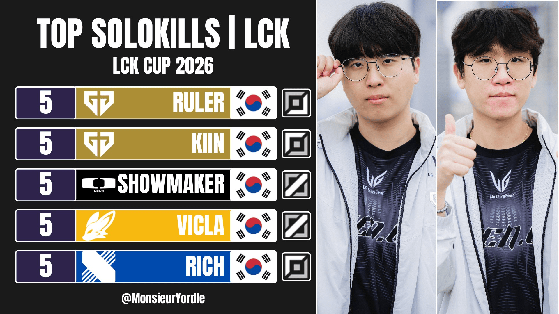 LCK杯目前单杀榜:Ruler、Kiin和ShowMaker等5次单杀最多
