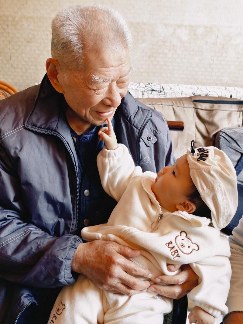 1920年诞生的太姥爷,2026年迎来刚出生的重孙,106岁的年龄鸿沟,竟被一双牵手暖得没了距离。 (个人观点仅供参考,无任何不良引导) 屋里飘着婴儿奶香混着水果清甜,阳光透过窗帘在地板铺出暖融融的光斑,亲戚们围在四周,说话都放轻了嗓门。太姥爷穿件藏青棉袍,被家人扶着坐在藤椅上,枯瘦的手紧紧攥着个绣着福字的小红包,指腹在布料上反复摩挲,浑浊的眼眸里满是按捺不住的期盼。宝宝裹在鹅黄色襁褓里,被妈妈托在臂弯,小脑袋歪着,睫毛像两把小扇子,偶尔吐出小舌头,发出细弱的咿呀声。 妈妈慢慢挪到太姥爷跟前,把宝宝轻轻递到他能看清的地方。原本静坐的太姥爷忽然直了直腰,目光瞬间锁定襁褓里的小家伙,眼里像是燃起了簇小火苗,满是疼惜。他缓缓抬起手,那双手爬满皱纹,指关节突出,是扛过生活重担、经受过岁月风霜的模样,此刻却抖得厉害,一点点朝着宝宝的小手探去,生怕稍一用力就惊扰了这娇嫩的小生命。 宝宝像是感应到这份慈爱,小拳头猛地张开,恰好握住太姥爷的一根手指。那画面美得让人鼻尖发酸,太姥爷的手粗糙如老藤,却裹着化不开的暖意;宝宝的手粉嫩似花苞,透着鲜活的生命力。太姥爷盯着宝宝的脸,嘴角咧开慈祥的笑容,嘴里念念有词,声音虽轻却满是欢喜,眼神黏在宝宝脸上,仿佛要把这家族新成员的模样刻进骨子里。 满屋人看得眼眶发热,有人悄悄抹了眼泪。106年光阴,太姥爷从动荡年代走到国泰民安,见证过世事变迁,经历过风雨沧桑,如今能亲手触碰家族的新生力量,这何尝不是人生难得的圆满?“岁月有情,世代荣昌”,百岁老人是家族的根,新生宝宝是家族的芽,一老一小,一头连着百年过往,一头系着未来希望,这份血脉相连的温情,最是动人。 幸福从不是锦衣玉食的堆砌,而是家人安康、血脉延续的踏实。这场跨越世纪的相见,是亲情的传承,是生命的接力。皱纹里藏着的疼爱,襁褓中裹着的希望,让时光有了温度,让亲情有了重量,这便是家族最珍贵的财富,生生不息,温暖绵长。