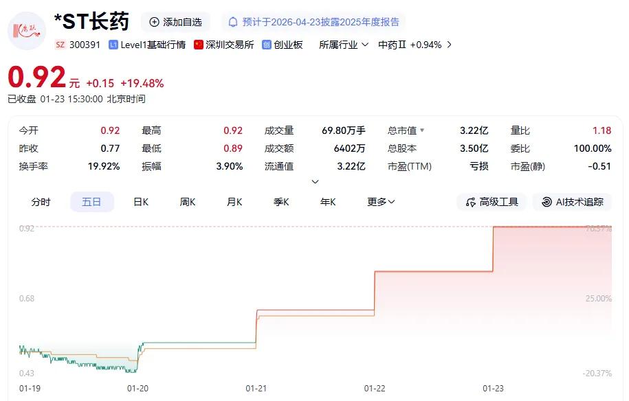 截至1月23日,*ST长药连续4个交易日涨停,累计涨幅达109.09%,最新股价报0.92元/股,总市值为3.22亿元。