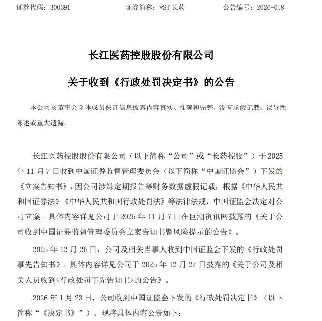 1月23日,证监会对*ST长药(300391)下发《行政处罚决定书》,认定其在2021年至2023年间连续三年通过虚增收入与利润进行财务造假,触及重大违法强制退市情形,深交所同步对公司下发终止上市《事先告知书》,启动退市程序。公司股票自2026年1月26日(星期一)开市起停牌。