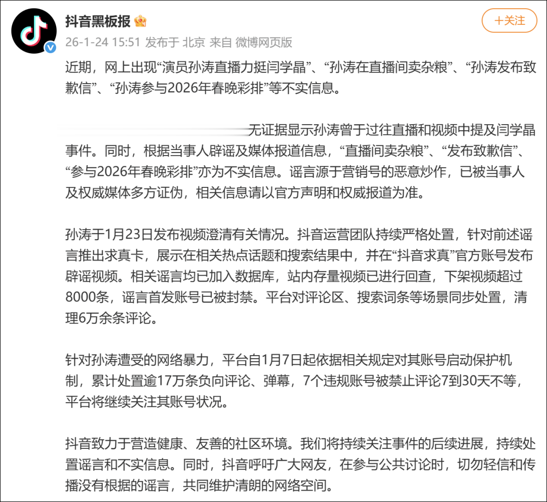 孙涛于1月23日发布视频澄清有关情况。抖音运营团队持续严格处置,针对前述谣言推出求真卡,展示在相关热点话题和搜索结果中,并在“抖音求真”官方账号发布辟谣视频。相关谣言均已加入数据库,站内存量视频已进行回查,下架视频超过8000条,谣言首发账号已被封禁。平台对评论区、搜索词条等场景同步处置,清理6万余条评论。