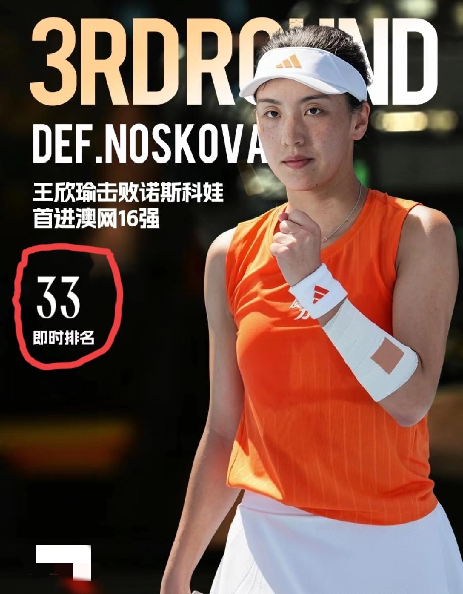 恭喜王欣瑜2:0击败诺斯科娃,职业生涯首进澳网16强,她的即时排名也来到了第33