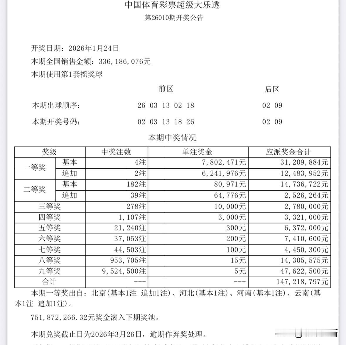 780万头奖!大乐透全国4注780万其中2注追加达1404万元花落北京云南,另外河北河南分别1注基本头奖,其中河北彩友很猛几乎每期大盘彩都中奖。二等奖182注8万元数量明显偏多,导致单注未能达到10万,对二等奖中奖难度来说这个奖金实在不高,追加后也只有14万而已。不知道评论区有中浮动奖的大神没?[呲牙][呲牙]