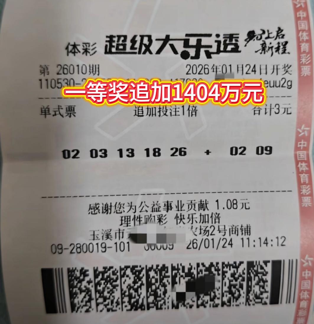 来一睹1404万大奖票的幸运真容!大乐透第26010期开奖揭晓,本期共开出4注一等奖追加2注,其中一注追加花落云南玉溪。令人惊叹的是,中奖者仅凭一注单式追加、仅投入3元,便一举揽获千万巨奖,如此运气,实在令人艳羡。 莫非有福星眷顾云岭大地?今年以来,云南大乐透已累计中出9注一等奖,其中包含2注追加奖。更值得一提的是,在第007期开奖中,曾有一人独中2注一等奖,好运连连,堪称佳话。