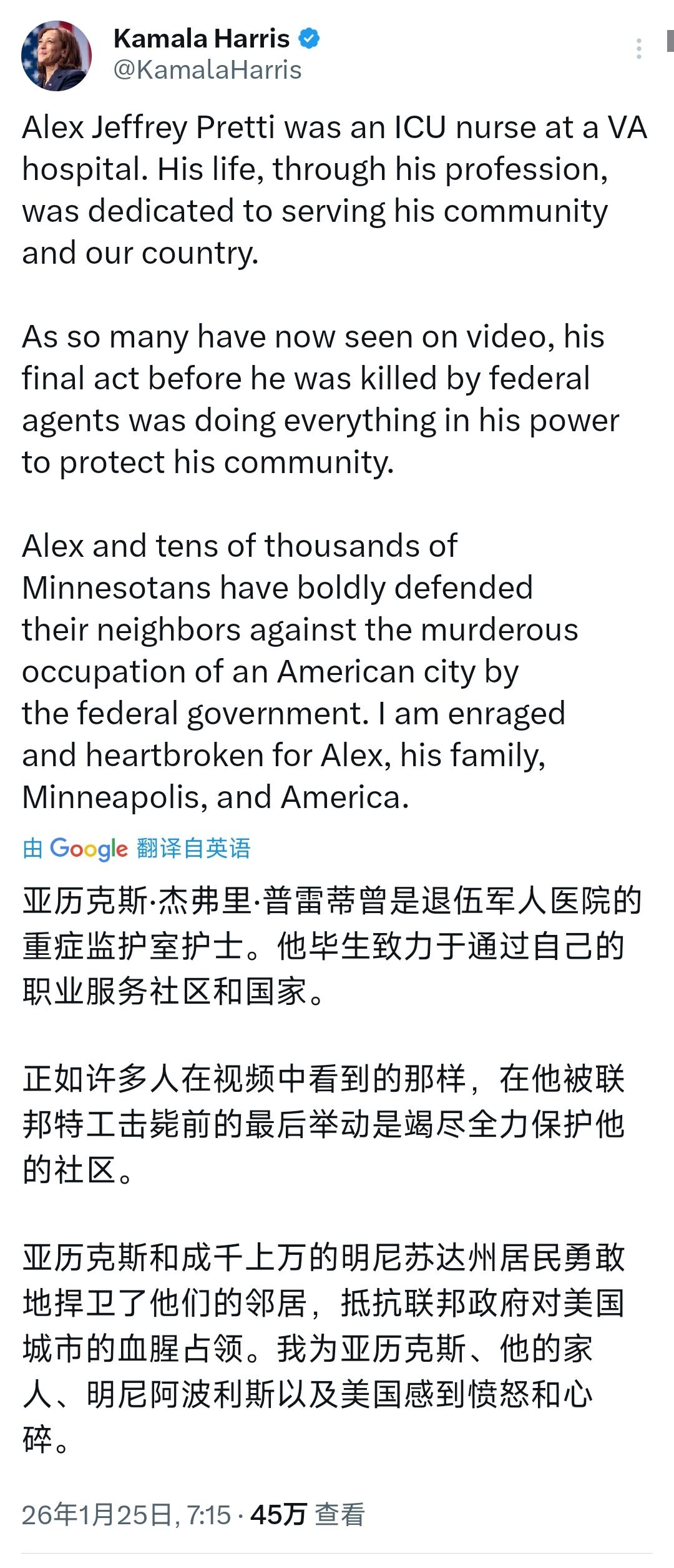 美国前副总统卡玛拉·哈里斯今天(北京时间1月25日)发文写道:“亚历克斯·杰弗里·普雷蒂曾是退伍军人医院的重症监护室护士。他毕生致力于通过自己的职业服务社区和国家。正如许多人在视频中看到的那样,在他被联邦特工击毙前的最后举动是竭尽全力保护他的社区。亚历克斯和成千上万的明尼苏达州居民勇敢地捍卫了他们的邻居,抵抗联邦政府对美国城市的血腥占领。我为亚历克斯,他的家人,明尼阿波利斯以及美国感到愤怒和心碎。” [机智]评几句:明尼苏达再爆执法射杀悲剧,37岁急诊护士亚历克斯身中数枪殒命,视频铁证显示他手持手机拍摄而非持枪反抗,国土安全部“自卫”说辞被州长沃尔兹痛斥为彻头彻尾的谎言,特朗普却颠倒黑白指责州长煽动叛乱、掩盖所谓案件,其蛮横偏袒尽显荒谬。这起悲剧赤裸裸暴露美国执法暴力泛滥、官方撒谎成性的积弊,更撕开联邦与地方对立、两党撕裂社会的狰狞裂痕。亚历克斯毕生服务社区与国家,哈里斯所言的“血腥占领”道破民众心声,美国标榜的人权正义早已沦为空谈,权力凌驾真相、党争撕裂共识,鲜活生命成了霸权执法与政治博弈的牺牲品,这样的美国,只剩谎言与撕裂在吞噬民众的安全感与国家根基。