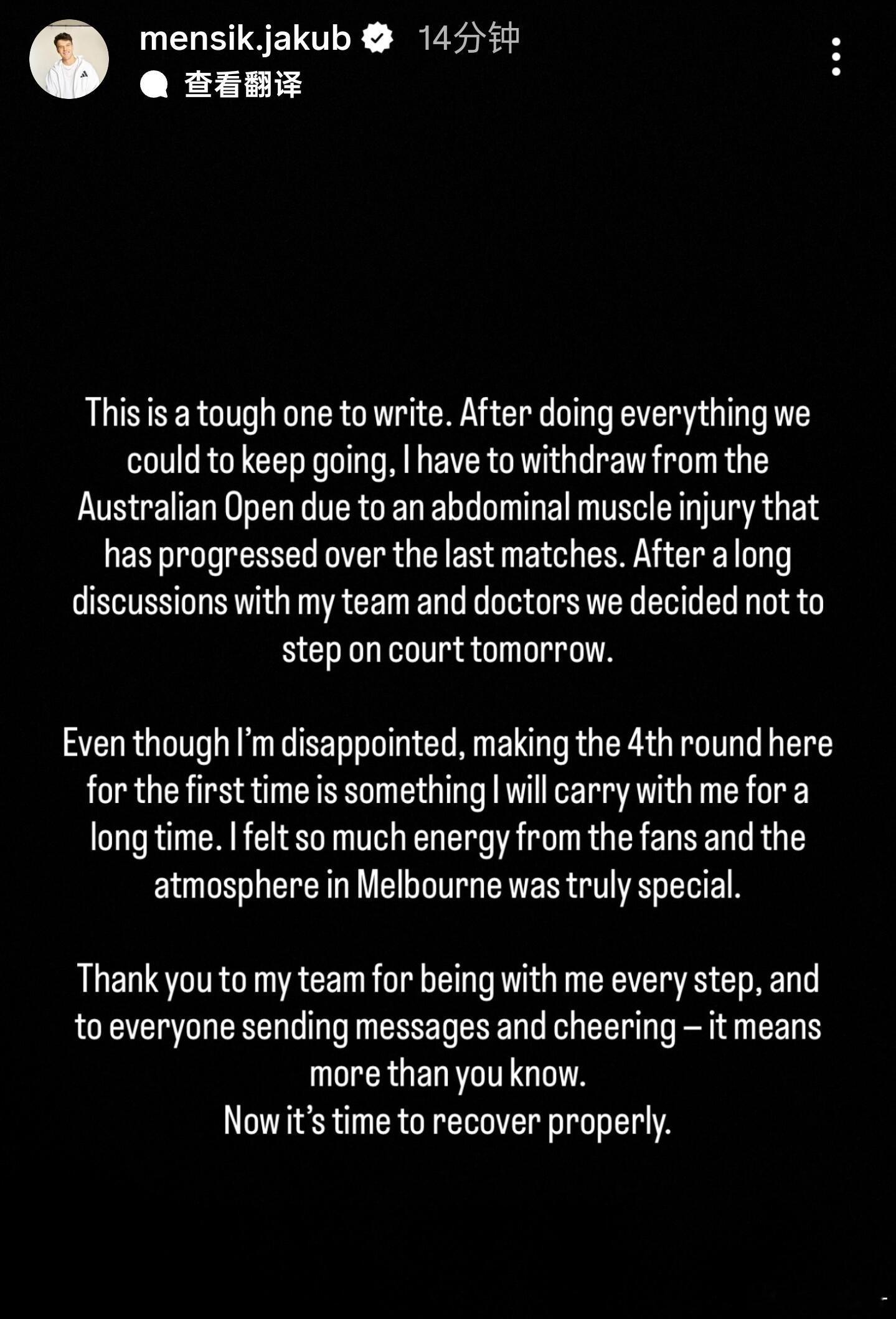 门希克澳网因伤退赛澳网2026 男单第四轮,16号种子门希克因腹部肌肉伤势加重宣