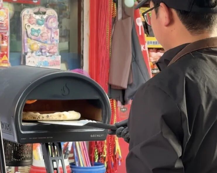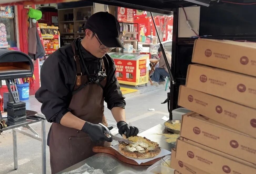 下午三点,陆玉虎骑着小车来到塔海村的街头,准备好食材和工具后,披萨小摊便开始营业了。他站在简易烤炉前,熟练地将揉好的面饼摊开,铺上芝士与馅料,送入烤炉。不一会儿,金黄焦香的披萨便新鲜出炉,滋滋作响的热气里,满是市井的温暖与创业的执着。