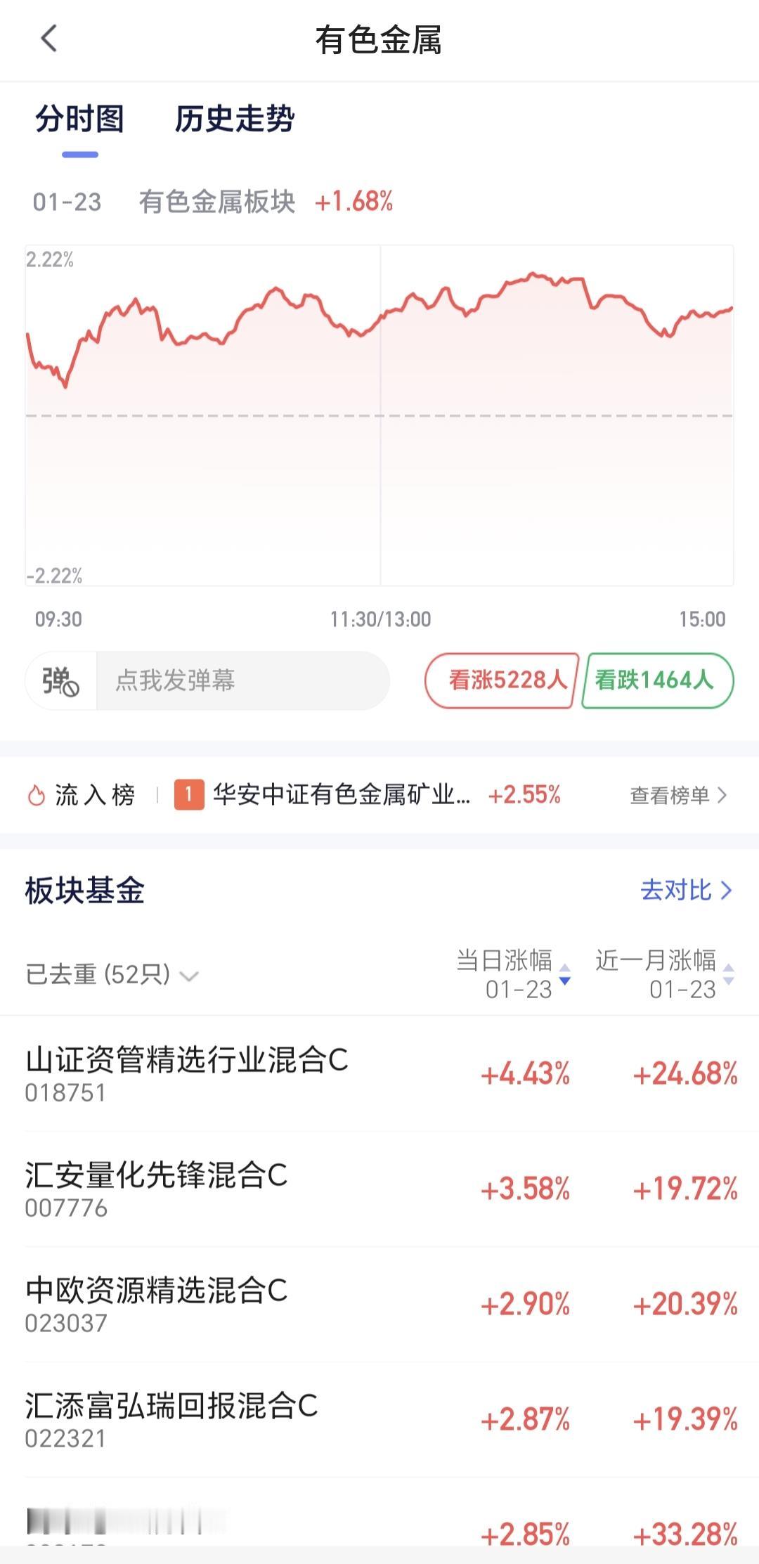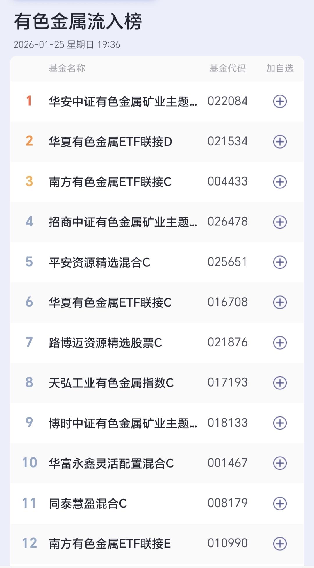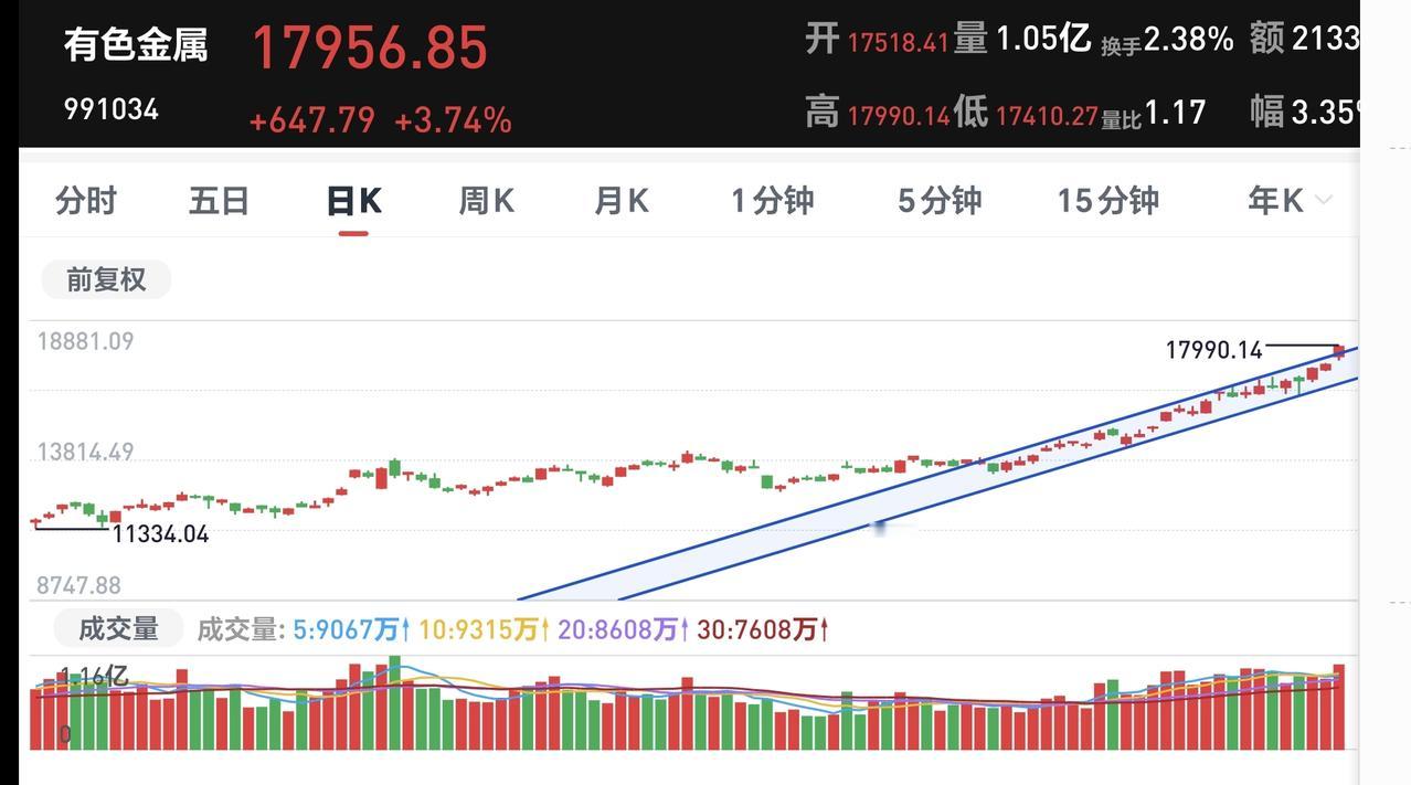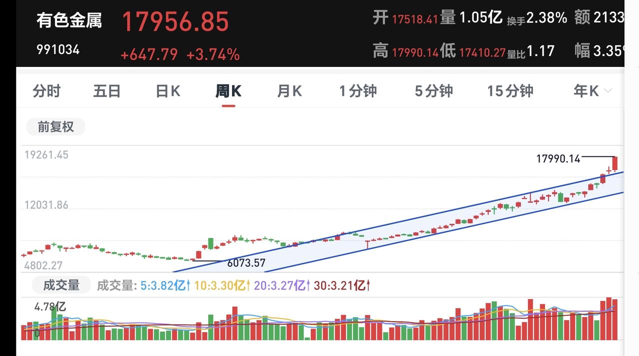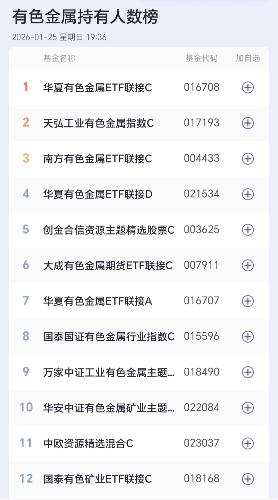 基金:有色金属板块应该怎么办 有色金属是一个老的板块,这个板块在“煤飞色舞”的年代辉煌过,现在是爆发的第二春,这从持有人数就可以看出来,板块持有人数在所有板块当中排名第2位,是散户众多的一个板块。 这个板块上周五上涨了1.68%,加仓人数排行榜见下面的截图3,持有人数排行榜见下面的截图4,加仓人数最多的是华安中证有色金属,持有人数最多的是华夏有色金属ETF。 看下面的截图5,有色金属板块周五上涨突破了上涨通道的上轨,这个上涨通道是日线级别的短期上涨通道,上涨通道的下轨线是短线持有者的持有条件,长线持有者不可以以这条下轨线为标准。 看下面的截图6,这是有色金属板块周K线图,最近的加速上涨没有改变板块的上涨趋势,长线持有的人以周线级别上涨通道的下轨线为持有条件,下轨线之上的涨跌都可以忽略。 不管是热门板块还是冷门板块,不管是盈利的板块还是亏损的板块,单只基金的持有占比都不可以过高,最好是不要超过20%,这可以极大降低自己整体的持有风险,人多的地方不去,热闹的地方不去,如果你原来就身在其中,那是没有办法的事情,如果你想追高进场,等待你的不一定都是好事。 大家帮忙评论,点赞,转发和分享,谢谢大家的支持。