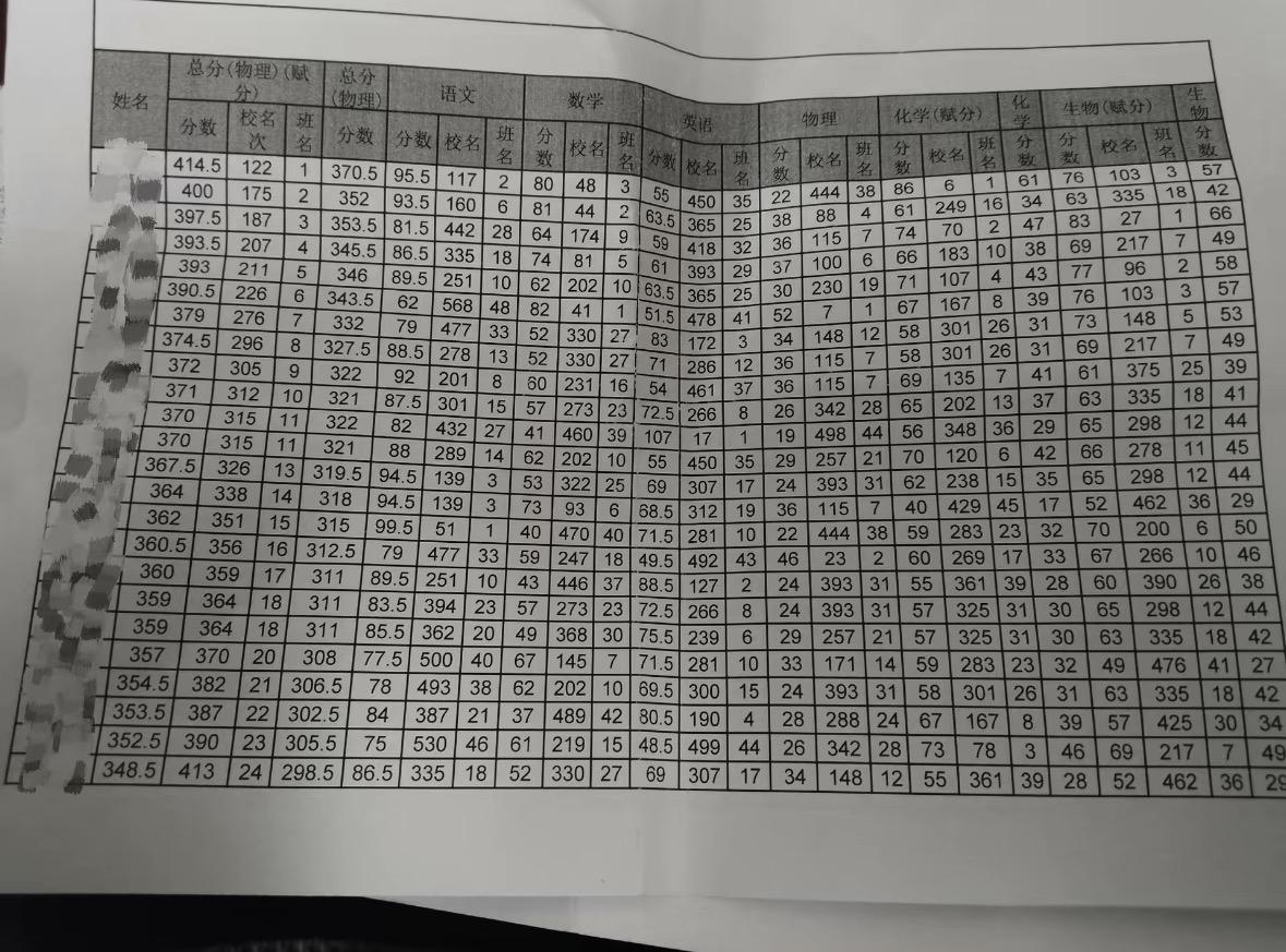 这是县城普通高中普通班高三期末考试成绩,一个班36人能走本科的屈指可数,大部分学生只能走大专或者复读继续读高三,班级第一名原始分370赋分后分数415,年级排名122,班级第二名原始分352赋分后400分,年级175名,其他学生原成绩赋分后还不到400分,这样的成绩指望孩子考211的不可能,能读个民办本科就不错了。