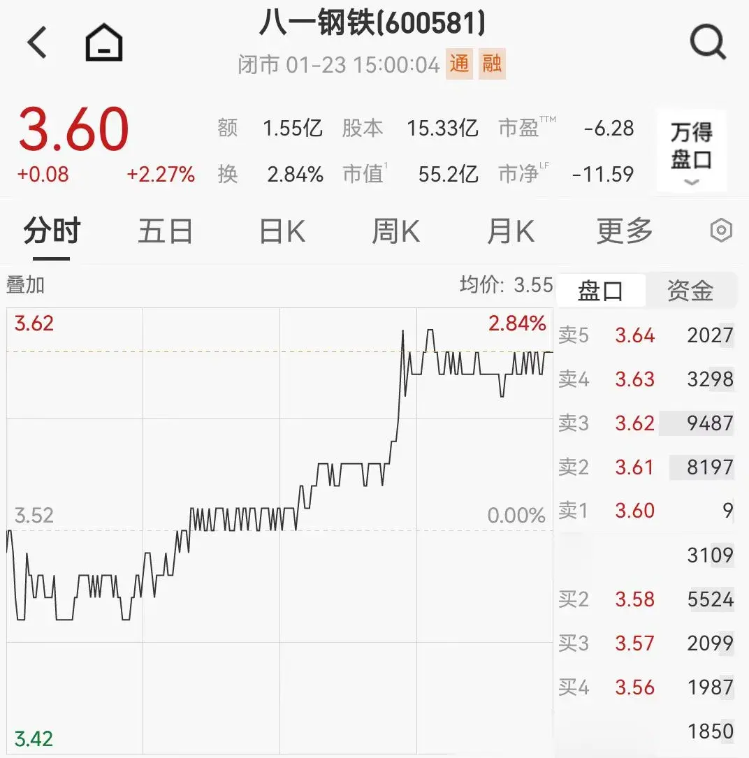 二级市场上,截至1月23日收盘,八一钢铁上涨2.27%报3.60元/股,总市值约55.2亿元,近一年来公司股价累计上涨约两成。