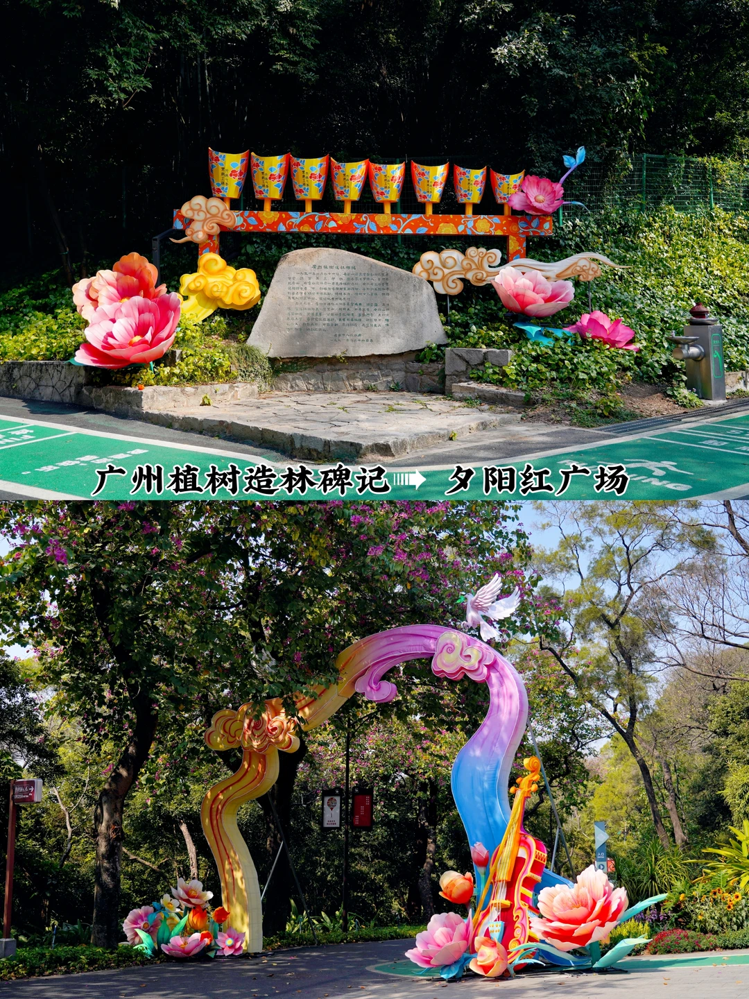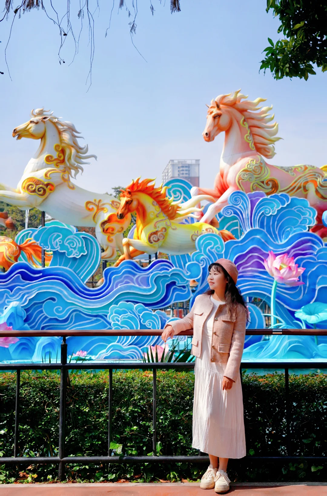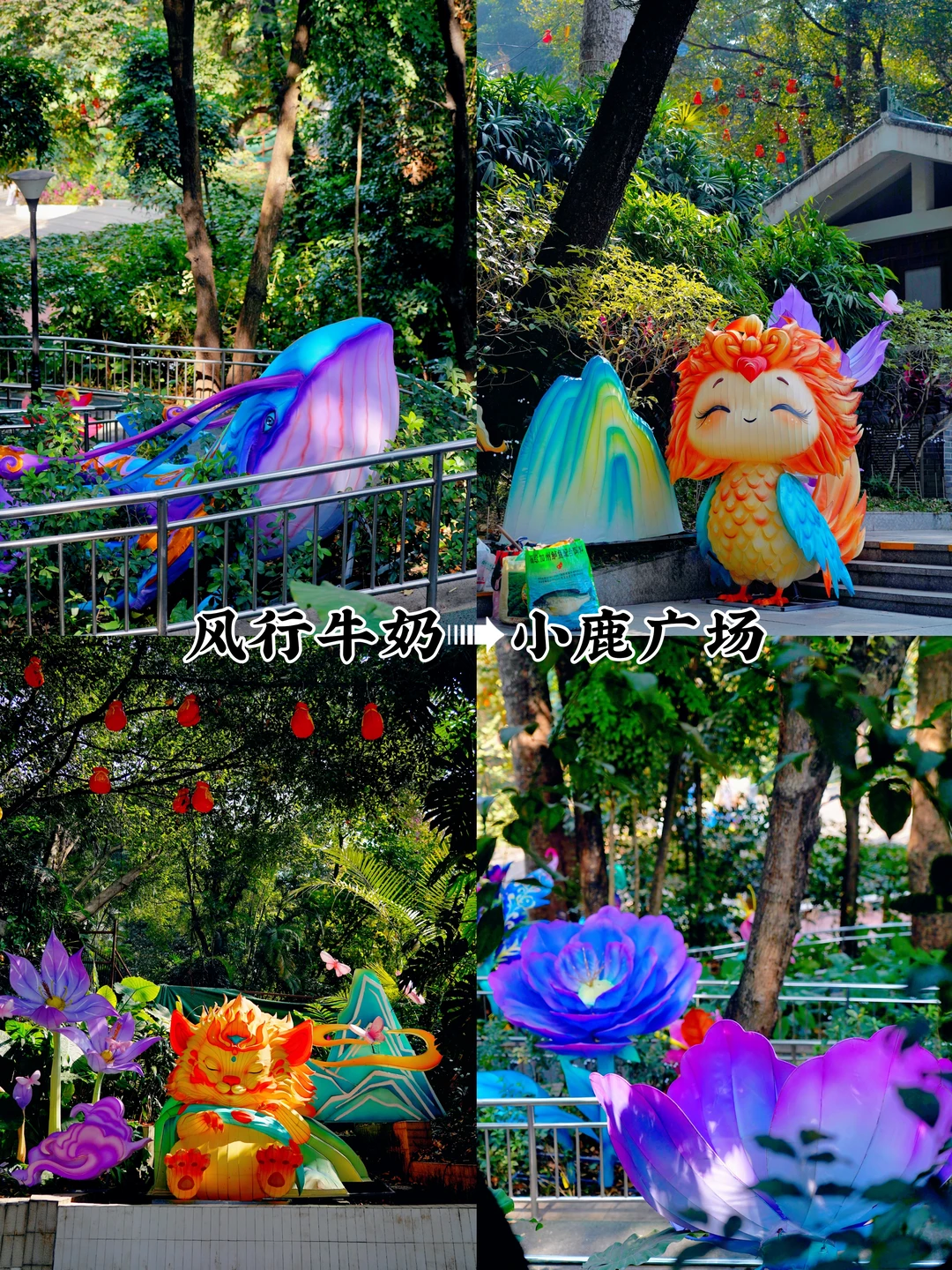 🏮《大吉大利》:11米高的聚宝盆灯组,寓意新年财源滚滚来➠🏮C位灯组《万马奔腾》:百米非遗彩灯“万马奔腾”,气势恢弘,游船划过,波光倒影很是好看➠ 🏮《祥马贺岁》:传统生肖与现代霓虹光影结合,宛如梦幻的时空隧道(沿万马奔腾的河边走到风行牛奶右转上山,往小鹿广场走➠ 夕阳红广场➠ 韩国园➠🏮《爱漾越秀》:60米长的爱心挂件灯带,亮灯后浪漫氛围拉满➠ 回到正门